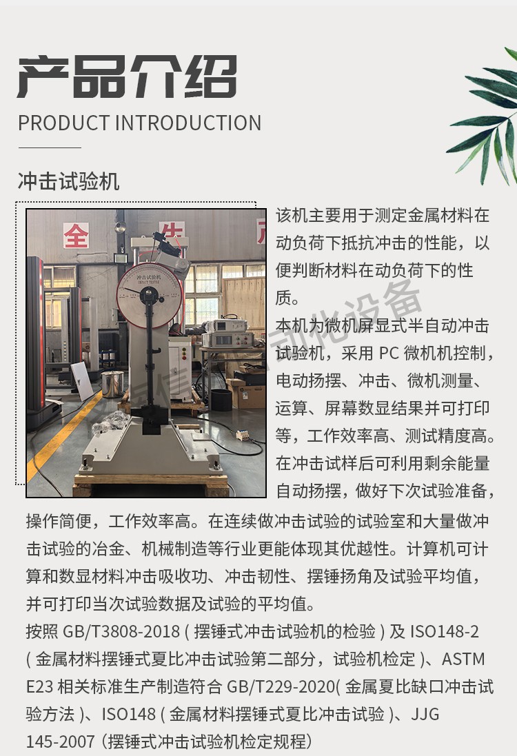本機(jī)為微機(jī)屏顯式半自動(dòng)沖擊試驗(yàn)機(jī),采用PC微機(jī)機(jī)控制,電動(dòng)揚(yáng)擺、沖擊、微機(jī)測量、運(yùn)算、屏幕數(shù)顯結(jié)果并可打印等,工作效率高、測試精度高。在沖擊試樣后可利用剩余能量自動(dòng)揚(yáng)擺,做好下次試驗(yàn)準(zhǔn)備,操作簡便,工作效率高。在連續(xù)做沖擊試驗(yàn)的試驗(yàn)室和大量做沖擊試驗(yàn)的冶金、機(jī)械制造等行業(yè)更能體現(xiàn)其優(yōu)越性。計(jì)算機(jī)可計(jì)算和數(shù)顯材料沖擊吸收功、沖擊韌性、擺錘揚(yáng)角及試驗(yàn)平均值,并可打印當(dāng)次試驗(yàn)數(shù)據(jù)及試驗(yàn)的平均值。 按照 GB/T3808-2018 (擺錘式?jīng)_擊試驗(yàn)機(jī)的檢驗(yàn))及 ISO148-2(金屬材料擺錘式夏比沖擊試驗(yàn)第二部分,試驗(yàn)機(jī)檢定)、ASTM E23 相關(guān)標(biāo)準(zhǔn)生產(chǎn)制造符合 GB/T229-2020(金屬夏比缺口沖擊試驗(yàn)方法)、ISO148 (金屬材料擺錘式夏比沖擊試驗(yàn))、JJG 145-2007 (擺錘式?jīng)_擊試驗(yàn)機(jī)檢定規(guī)程) 四、主要技術(shù)指標(biāo): 1、沖擊能量:150J、300J 2、擺錘預(yù)揚(yáng)角:150° 3、擺軸中心至沖擊點(diǎn)距離:750mm 4、沖擊速度:5.2m/s 5、試樣支座跨距:40mm 6、鉗口圓角:R1-1.5mm 7、沖擊刀刃圓角:R2-2.5mm 8、沖擊刀厚度:16mm 9、角度準(zhǔn)確度:±0.1° 10、試樣尺寸:10×10×55mm 11、外形尺寸:2124 mm×600 mm×1340 mm 12、試驗(yàn)機(jī)凈重:450Kg 13、電源:交流三相 380V±10% 50HZ 5A 14、環(huán)境條件:周圍環(huán)境中無腐蝕介質(zhì),無震動(dòng),無強(qiáng)電磁場干擾。 五、設(shè)備主要配置: 1、300焦耳主機(jī)一臺(tái); 2、150J、300J 擺錘各一個(gè) 3、取擺傳動(dòng)裝置一套(裝在主機(jī)上) 4、自動(dòng)掛擺裝置一套(裝在主機(jī)上) 5、保險(xiǎn)機(jī)構(gòu)一套(裝在主機(jī)上) 6、安全防護(hù)裝置一套 7、擺錘拆卸器一只 8、支座調(diào)校器一只 9、試樣對(duì)中器一只 10、聯(lián)想打印機(jī)一套 專用測量軟件一套