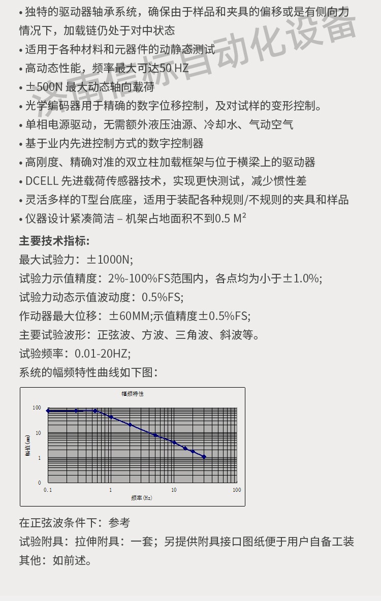優(yōu)勢特點(diǎn): ?無需油源的直線電機(jī)技術(shù),保證潔凈的測試環(huán)境 ? 軸向通道采用Can總線式控制方式 ? 高速直線作動器 ? 獨(dú)特的驅(qū)動器軸承系統(tǒng),確保由于樣品和夾具的偏移或是有側(cè)向力情況下,加載鏈仍處于對中狀態(tài) ? 適用于各種材料和元器件的動靜態(tài)測試 ? 高動態(tài)性能,頻率最大可達(dá)50 Hz ? ±500N 最大動態(tài)軸向載荷 ? 光學(xué)編碼器用于精確的數(shù)字位移控制,及對試樣的變形控制。 ? 單相電源驅(qū)動,無需額外液壓油源、冷卻水、氣動空氣 ? 基于業(yè)內(nèi)先進(jìn)控制方式的數(shù)字控制器 ? 高剛度、精確對準(zhǔn)的雙立柱加載框架與位于橫梁上的驅(qū)動器 ? Dcell 先進(jìn)載荷傳感器技術(shù),實(shí)現(xiàn)更快測試,減少慣性差 ? 靈活多樣的T型臺底座,適用于裝配各種規(guī)則/不規(guī)則的夾具和樣品 ? 儀器設(shè)計緊湊簡潔 – 機(jī)架占地面積不到0.5 m2 優(yōu)勢特點(diǎn): ?無需油源的直線電機(jī)技術(shù),保證潔凈的測試環(huán)境 ? 軸向通道采用Can總線式控制方式 ? 高速直線作動器 ? 獨(dú)特的驅(qū)動器軸承系統(tǒng),確保由于樣品和夾具的偏移或是有側(cè)向力情況下,加載鏈仍處于對中狀態(tài) ? 適用于各種材料和元器件的動靜態(tài)測試 ? 高動態(tài)性能,頻率最大可達(dá)50 Hz ? ±500N 最大動態(tài)軸向載荷 ? 光學(xué)編碼器用于精確的數(shù)字位移控制,及對試樣的變形控制。 ? 單相電源驅(qū)動,無需額外液壓油源、冷卻水、氣動空氣 ? 基于業(yè)內(nèi)先進(jìn)控制方式的數(shù)字控制器 ? 高剛度、精確對準(zhǔn)的雙立柱加載框架與位于橫梁上的驅(qū)動器 ? Dcell 先進(jìn)載荷傳感器技術(shù),實(shí)現(xiàn)更快測試,減少慣性差 ? 靈活多樣的T型臺底座,適用于裝配各種規(guī)則/不規(guī)則的夾具和樣品 ? 儀器設(shè)計緊湊簡潔 – 機(jī)架占地面積不到0.5 m2