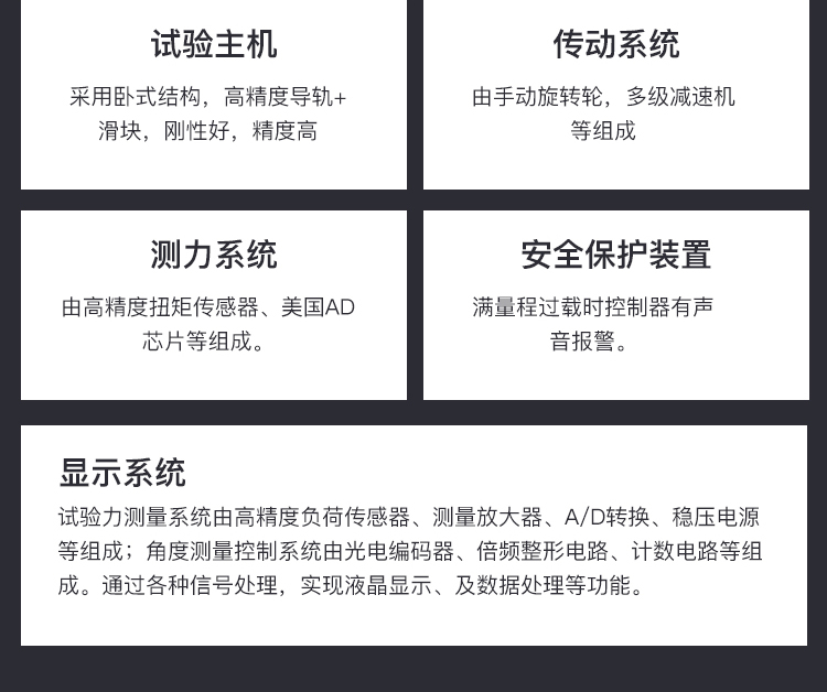 五、系統(tǒng)配置 1.主機(jī)一臺; 2.高精密導(dǎo)軌+滑塊二副; 3.減速系統(tǒng)一套 4.高精度負(fù)荷傳感器一只; 5.噴塑外殼一套 6.電源線、數(shù)據(jù)線各一根 7.地腳螺栓一套 8.試驗(yàn)工具一套 9.扭轉(zhuǎn)附具一套 10.說明書、合格證、裝箱單各一份 11.全數(shù)字MCU控制系統(tǒng)一套;
