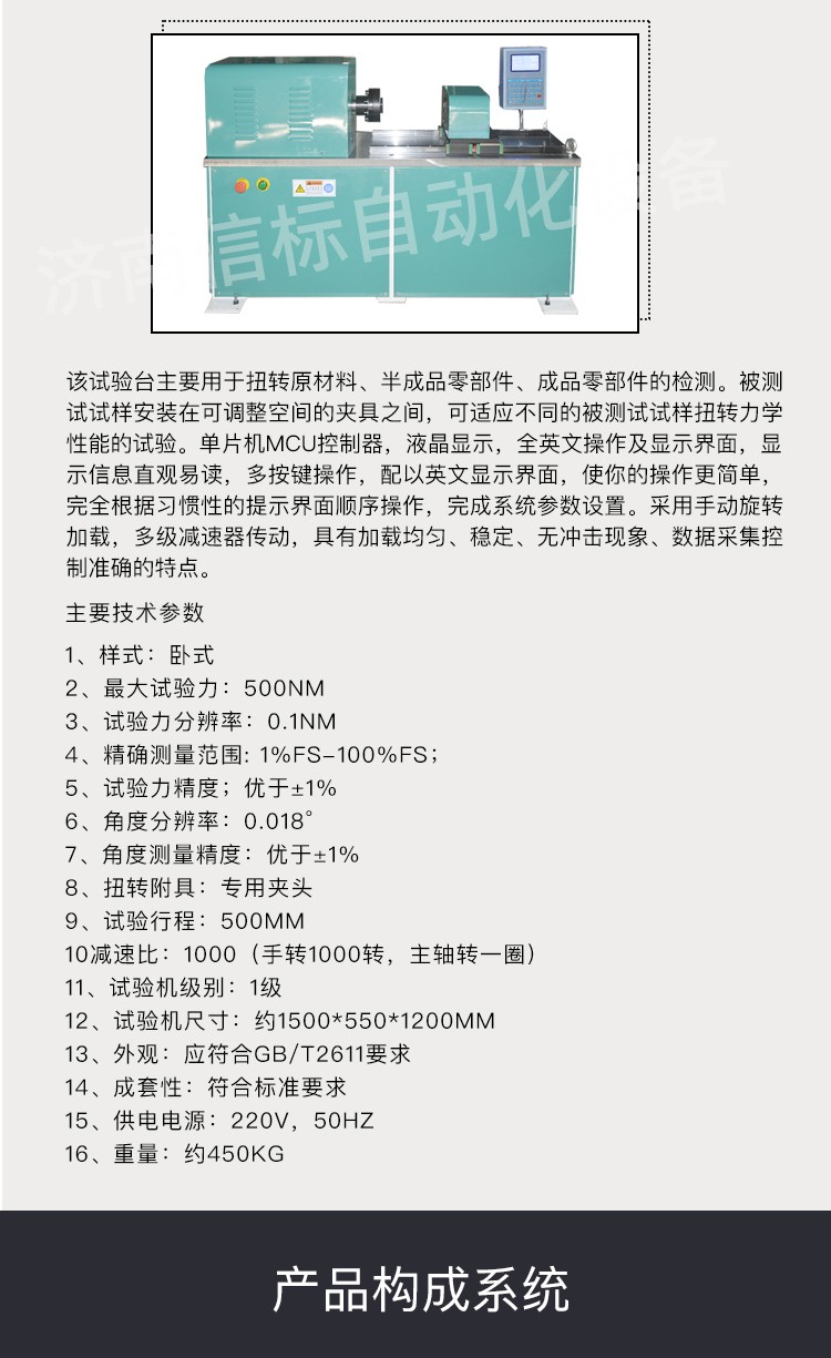 1、可以實(shí)現(xiàn)合格性試驗(yàn):判定扭矩扭角間的對應(yīng)關(guān)系,觀察試驗(yàn)是否變形、或是破壞 2、可以實(shí)現(xiàn)破壞性試驗(yàn):扭斷試驗(yàn),扭至試樣斷裂,求取峰值 三、產(chǎn)品構(gòu)成系統(tǒng): 1 試驗(yàn)主機(jī):采用臥式結(jié)構(gòu),高精度導(dǎo)軌+滑塊,剛性好,精度高。 2 傳動系統(tǒng):由手動旋轉(zhuǎn)輪,多級減速機(jī)等組成。 3 測力系統(tǒng):由高精度扭矩傳感器、美國AD芯片等組成。 4 顯示系統(tǒng):試驗(yàn)力測量系統(tǒng)由高精度負(fù)荷傳感器、測量放大器、A/D轉(zhuǎn)換、穩(wěn)壓電源等組成;角度測量控制系統(tǒng)由光電編碼器、倍頻整形電路、計數(shù)電路等組成。通過各種信號處理,實(shí)現(xiàn)液晶顯示、及數(shù)據(jù)處理等功能。 5 安全保護(hù)裝置:滿量程過載時控制器有聲音報警。