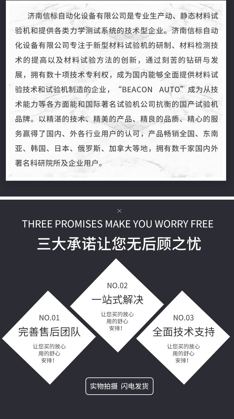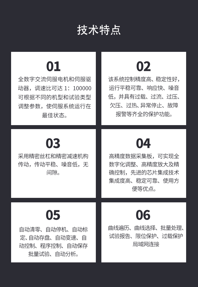 測(cè)量參數(shù): 1. 最大試驗(yàn)力: 10/20/30/50kN 2. 試驗(yàn)力測(cè)量范圍: 0.4%--100%。 3. 試驗(yàn)力示值精度:優(yōu)于示值±1% 4. 試驗(yàn)力分辨力:1/500000 5. 橫梁位移測(cè)量精度:分辨率高于0.0025mm 6. 變形測(cè)量精度: ±0.5% 7. 試驗(yàn)速度范圍:0.0002—500mm/min,無級(jí)調(diào)速 8. 速度控制精度:±1%(0.0002~50mm/min); ±0.5%(50~3500mm/min) 9. 恒力、恒變形、恒位移控制范圍: 0.2%-100%FS 10.恒力、恒變形、恒位移控制精度: 設(shè)定值<10%FS時(shí),設(shè)定值的±1.0%以內(nèi) 設(shè)定值≥10%FS時(shí),設(shè)定值的±0.1%以內(nèi) 11. 變形速率控制精度: 速率<0.05%FS時(shí)為±2.0%設(shè)定值內(nèi) 速率≥0.05%FS時(shí)為±0.5%設(shè)定值內(nèi) 12. 試驗(yàn)空間: A.拉伸空間:1000mm B.壓縮空間:1100mm C.寬度:450mm 13.下工作臺(tái):450*250 14. 壓盤尺寸:φ100 mm 15. 整機(jī)電源:單相,220V±10%,50Hz,功率:750 W 16. 工作環(huán)境:室溫—35℃,相對(duì)濕度不超過80% 17. 主機(jī)尺寸: 870×730×1750mm 18. 重量:400 kg 三、產(chǎn)品配置: 1、主機(jī) 一套 2、松下A7全數(shù)字伺服電機(jī)及伺服驅(qū)動(dòng)器; 一套 3、高精度負(fù)荷傳感器; 5kn/1kn/500N/200/ 各一支 4、Hiwin精密滾珠絲杠; 2支 5、光電編碼器(2500線,內(nèi)置); 1支 6、夾具:滿足海綿/汽車座椅所需工裝 1套(有多種) 7、三閉環(huán)測(cè)量系統(tǒng)一套,采用力,位移,應(yīng)變等多種控制方式,試驗(yàn)過程中可實(shí)時(shí)顯示力-位移,力-時(shí)間,應(yīng)力-應(yīng)變等多種試驗(yàn)曲線,并可自動(dòng)得出最大負(fù)荷,拉伸強(qiáng)度,斷裂伸長(zhǎng)率等多種結(jié)果參數(shù)。 8、HP品牌計(jì)算機(jī),21寸液晶顯示器; 9、打印機(jī):HPA4彩色噴墨打印機(jī); 10、專用試驗(yàn)軟件:可執(zhí)行GB,ISO,JIS、DIN,ASTM等多種試驗(yàn)標(biāo)準(zhǔn),全開放式,功能強(qiáng)大,方便操作,免費(fèi)提供升級(jí)軟件,并可根據(jù)用戶需求自行編輯試驗(yàn)軟件。