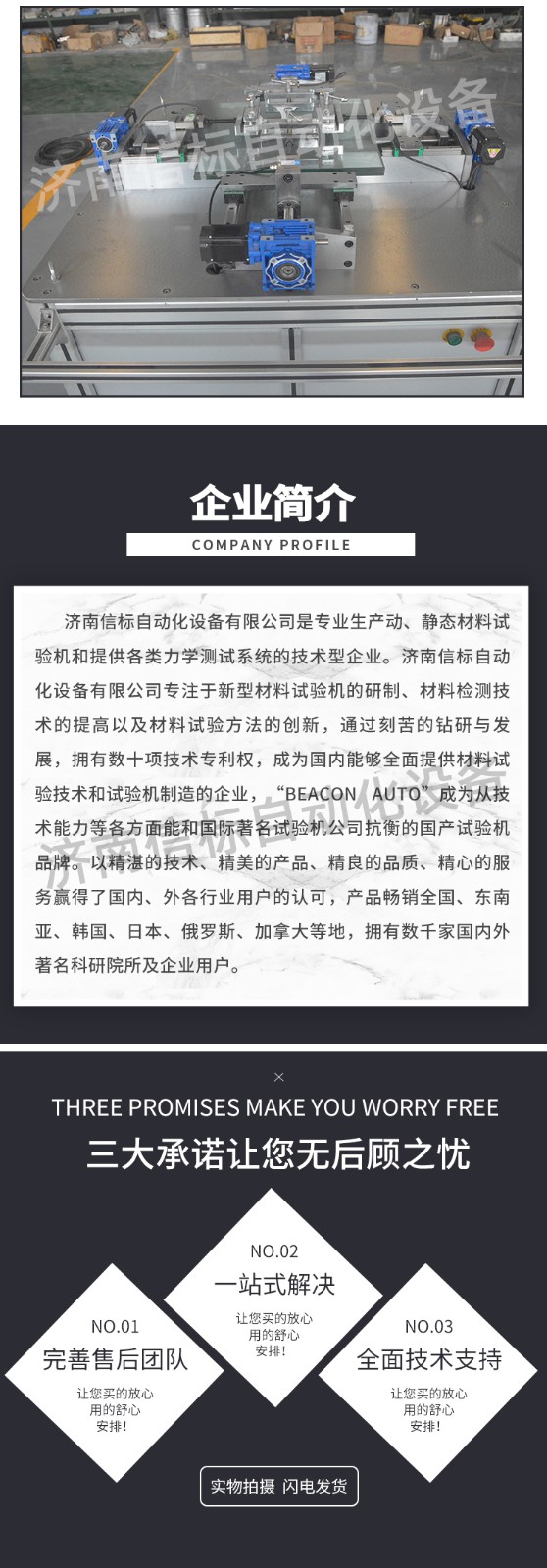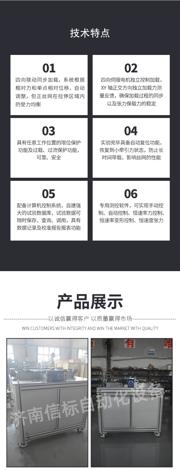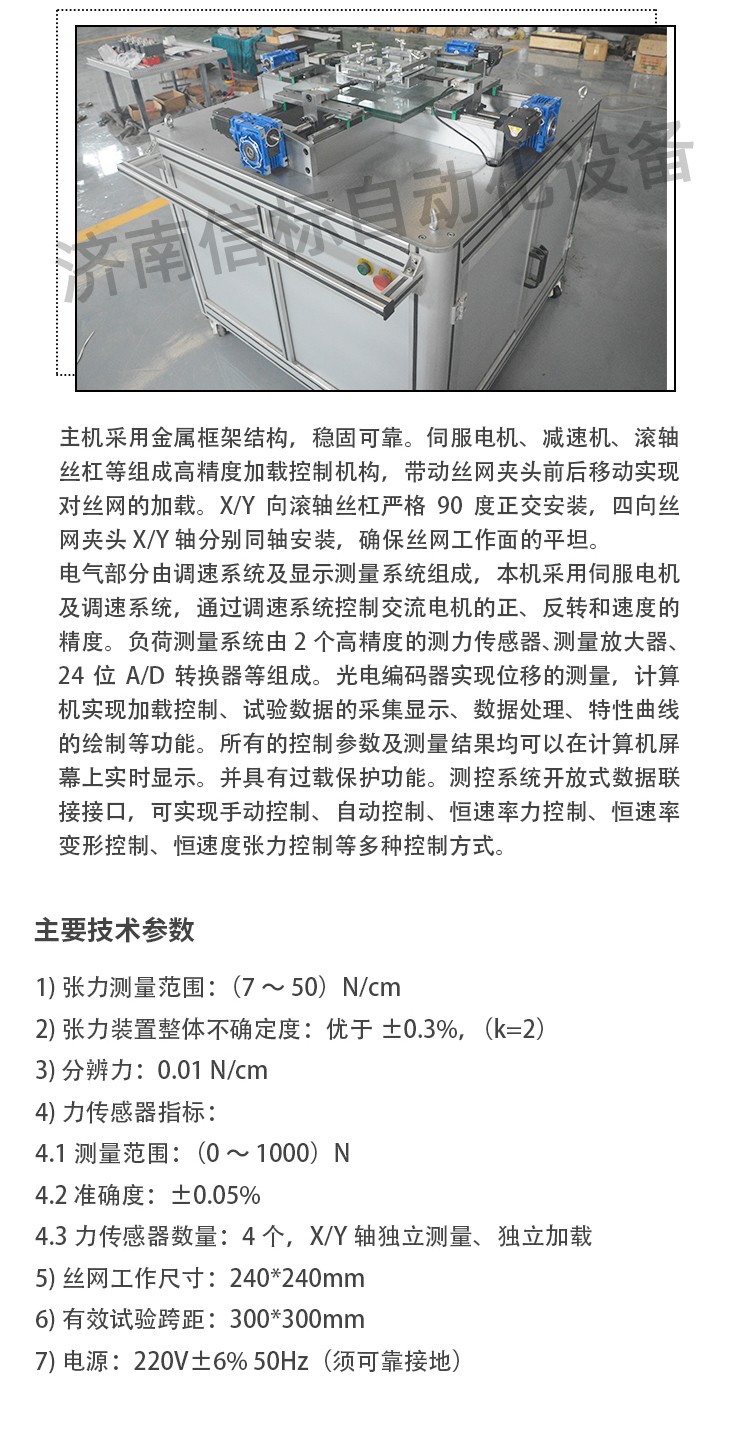 主要功能及技術(shù)指標(biāo): 1.主要技術(shù)指標(biāo) 1) 張力測(cè)量范圍:(7~50)N/cm 2) 張力裝置整體不確定度:優(yōu)于±0.3%,(k=2) 3) 分辨力:0.01 N/cm 4) 力傳感器指標(biāo): 4.1測(cè)量范圍:(0~1000)N 4.2 準(zhǔn)確度:±0.05% 4.3力傳感器數(shù)量:4個(gè),X/Y軸獨(dú)立測(cè)量、獨(dú)立加載 5) 絲網(wǎng)工作尺寸:240*240mm 6) 有效試驗(yàn)跨距:300*300mm 7) 電源:220V±6% 50Hz(須可靠接地) 2.主要功能: 1) 四向聯(lián)動(dòng)同步加載,系統(tǒng)根據(jù)相對(duì)力和單點(diǎn)相對(duì)位移,自動(dòng)調(diào)整,包正絲網(wǎng)在拉伸區(qū)域內(nèi)的受力均衡,較老式機(jī)械加載有本質(zhì)區(qū)別,軟件內(nèi)部增加縱橫纖維相對(duì)力補(bǔ)償算法),保證對(duì)絲網(wǎng)加載過程的四個(gè)方向受力均勻。 2) 四向伺服電機(jī)獨(dú)立控制加載,XY軸正交方向獨(dú)立加載力測(cè)量反饋,確保加載過程的同步以及張力保載力的穩(wěn)定。 3) 具有任意工作位置的限位保護(hù)功能及過載、過流保護(hù)功能,可靠、安全。 4) 實(shí)驗(yàn)完畢具備自動(dòng)復(fù)位功能,恢復(fù)到小牽引力狀態(tài),防止長(zhǎng)時(shí)間帶載,影響絲網(wǎng)的性能。 5) 配備計(jì)算機(jī)控制系統(tǒng),自建強(qiáng)大的試驗(yàn)數(shù)據(jù)庫,試驗(yàn)數(shù)據(jù)可隨時(shí)保存、查詢、調(diào)用,具有數(shù)據(jù)記錄及校準(zhǔn)報(bào)告報(bào)表功能。 6) 專用測(cè)控軟件,可實(shí)現(xiàn)手動(dòng)控制、自動(dòng)控制、恒速率力控制、恒速率變形控制、恒速度張力控制等多種控制方式。 軟件界面圖 7) 采用240mm絲網(wǎng),工作面更加穩(wěn)定,適用更多不同的張力計(jì)測(cè)量。絲網(wǎng)符合GB/T 5330《工業(yè)用金屬絲編織方孔篩網(wǎng)》或GB/T 14014《合成纖維篩網(wǎng)》標(biāo)準(zhǔn)要求,絲網(wǎng)目數(shù)大于20目/厘米