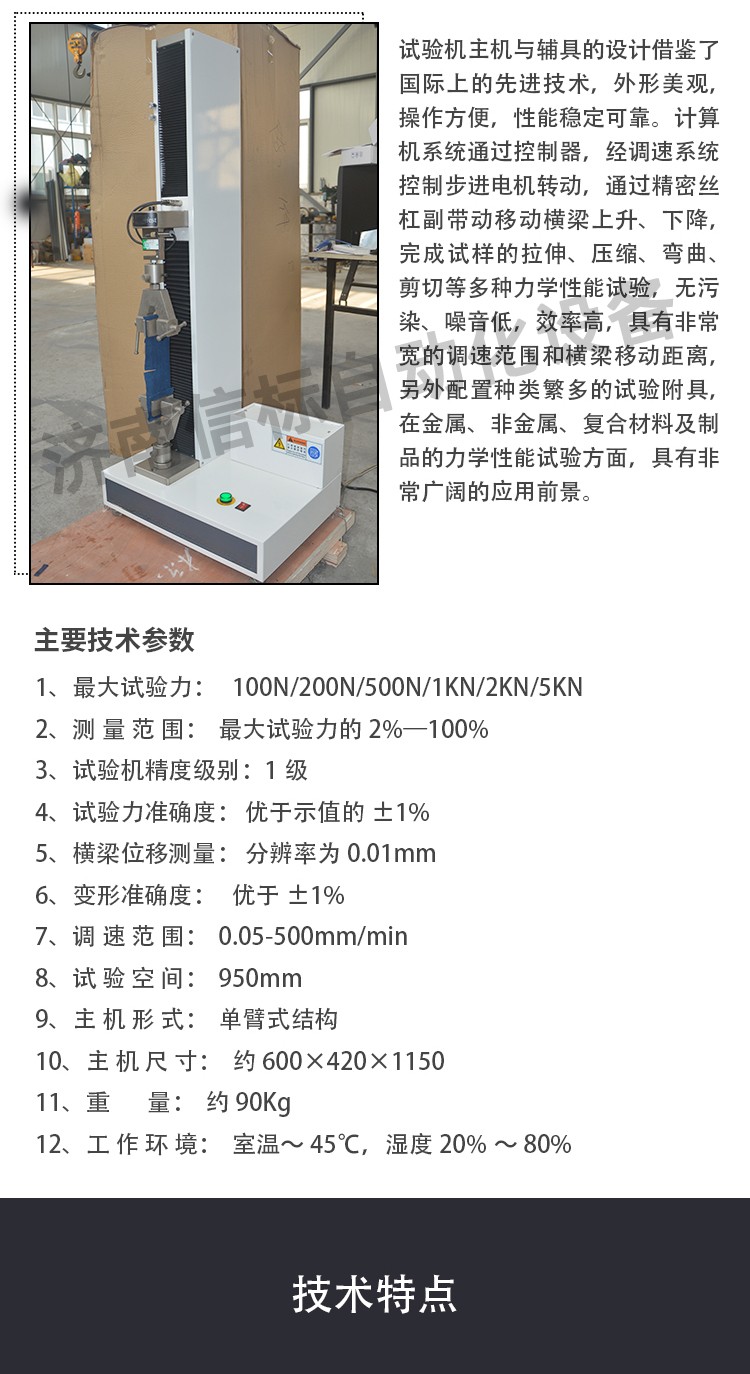 主要功能及特點(diǎn): 1、主機(jī): 1.1調(diào)速系統(tǒng)采用伺服電機(jī)和自主研發(fā)減速系統(tǒng),性能穩(wěn)定可靠,具有過流、過壓、過載等保護(hù)裝置。調(diào)速范圍可達(dá)0.05~500mm/min。 1.2傳動(dòng)部分采用圓弧同步齒形帶,精密絲杠副傳動(dòng),傳動(dòng)平穩(wěn),噪音低,傳動(dòng)效率高。 1.3萬向節(jié)采用十字插銷結(jié)構(gòu),而且具有擺角限制功能,一方面便于試樣夾持,保證試驗(yàn)同心度,另一方面很好的消除了不規(guī)則試樣對傳感器的影響。 2、控制系統(tǒng)、操作軟件及數(shù)據(jù)處理系統(tǒng) 2.1計(jì)算機(jī)控制系統(tǒng),具有集成度高、性能穩(wěn)定、調(diào)整方便等優(yōu)點(diǎn)??梢詫?shí)驗(yàn)數(shù)據(jù)進(jìn)行實(shí)時(shí)采集,對實(shí)驗(yàn)特性曲線實(shí)現(xiàn)實(shí)時(shí)動(dòng)態(tài)顯示,試驗(yàn)數(shù)據(jù)文件能以Access常用數(shù)據(jù)庫或SQLserve大型數(shù)據(jù)庫的方式保存,方便實(shí)現(xiàn)客戶的資源共享及網(wǎng)絡(luò)管理,以及用戶的再分析。對于用戶自定義的各種word2000報(bào)表,該軟件可輕松實(shí)現(xiàn)訪問,解決了不同用戶或同一用戶在不同時(shí)期對試驗(yàn)報(bào)表有不同需要的難題。該軟件可處理試驗(yàn)力、位移、 時(shí)間、變形的原始數(shù)據(jù)及由此派生的曲線。 2.2保護(hù)功能:該機(jī)具有軟件和機(jī)械兩種限位保護(hù)方式,超過最大負(fù)荷自動(dòng)停機(jī)的比例可動(dòng)態(tài)設(shè)定;具有過流、過壓、過載等多種保護(hù)功能。 2.3對于負(fù)荷、變形通道可實(shí)現(xiàn)自動(dòng)標(biāo)示,直觀方便。 2.4批量試驗(yàn)可實(shí)現(xiàn)曲線的分層次顯示,曲線自動(dòng)跟隨。 2.5該軟件可實(shí)現(xiàn)用戶自定義的速度設(shè)定,速度的計(jì)算機(jī)調(diào)整。還可實(shí)現(xiàn)高精度的速度標(biāo)定,隨時(shí)調(diào)整速度檔位和編碼。