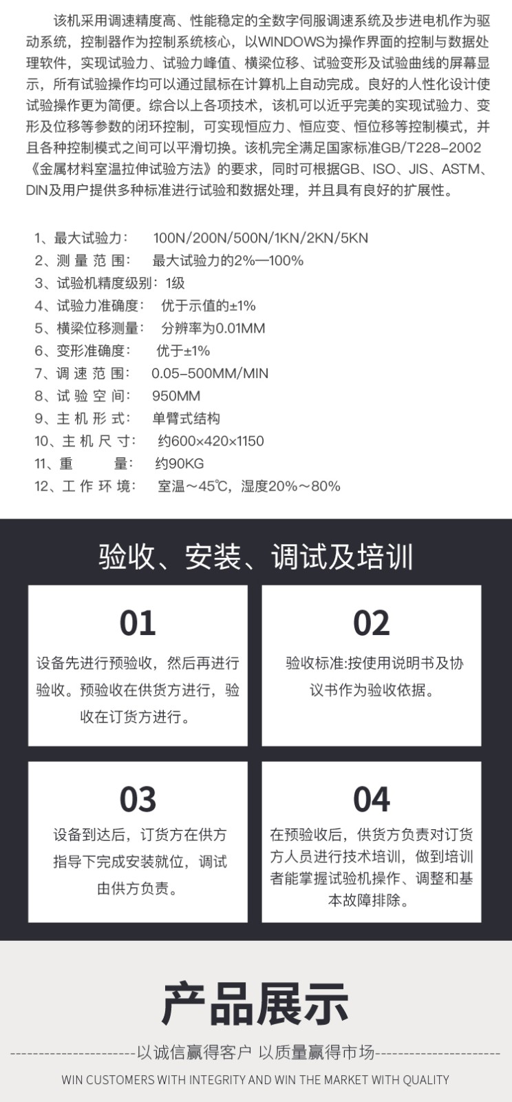 飯盒壓縮抗壓試驗(yàn)機(jī) 單臂壓力萬(wàn)能試驗(yàn)機(jī)主要技術(shù)指標(biāo): 1、 最大試驗(yàn)力: 100N/200N/500N/1KN/2KN/5KN 2、 測(cè) 量 范 圍: 最大試驗(yàn)力的2%—100% 3、 試驗(yàn)機(jī)精度級(jí)別:1級(jí) 4、 試驗(yàn)力準(zhǔn)確度: 優(yōu)于示值的±1% 5、 橫梁位移測(cè)量: 分辨率為0.01mm 6、 變形準(zhǔn)確度: 優(yōu)于±1% 7、 調(diào) 速 范 圍: 0.05-500mm/min 8、 試 驗(yàn) 空 間: 950mm 9、 主 機(jī) 形 式: 單臂式結(jié)構(gòu) 10、 主 機(jī) 尺 寸: 約600×420×1150 11、 重 量: 約90Kg 12、 工 作 環(huán) 境: 室溫~45℃,濕度20%~80% 飯盒壓縮抗壓試驗(yàn)機(jī) 單臂壓力萬(wàn)能試驗(yàn)機(jī)主要功能及特點(diǎn): 主機(jī): 1.1調(diào)速系統(tǒng)采用伺服電機(jī)和自主研發(fā)減速系統(tǒng),性能穩(wěn)定可靠,具有過(guò)流、過(guò)壓、過(guò)載等保護(hù)裝置。調(diào)速范圍可達(dá)0.05~500mm/min。 1.2傳動(dòng)部分采用圓弧同步齒形帶,精密絲杠副傳動(dòng),傳動(dòng)平穩(wěn),噪音低,傳動(dòng)效率高。 1.3萬(wàn)向節(jié)采用十字插銷(xiāo)結(jié)構(gòu),而且具有擺角限制功能,一方面便于試樣夾持,保證試驗(yàn)同心度,另一方面很好的消除了不規(guī)則試樣對(duì)傳感器的影響。 2、控制系統(tǒng)、操作軟件及數(shù)據(jù)處理系統(tǒng) 2.1計(jì)算機(jī)控制系統(tǒng),具有集成度高、性能穩(wěn)定、調(diào)整方便等優(yōu)點(diǎn)??梢詫?duì)實(shí)驗(yàn)數(shù)據(jù)進(jìn)行實(shí)時(shí)采集,對(duì)實(shí)驗(yàn)特性曲線(xiàn)實(shí)現(xiàn)實(shí)時(shí)動(dòng)態(tài)顯示,試驗(yàn)數(shù)據(jù)文件能以Access常用數(shù)據(jù)庫(kù)或SQLserve大型數(shù)據(jù)庫(kù)的方式保存,方便實(shí)現(xiàn)客戶(hù)的資源共享及網(wǎng)絡(luò)管理,以及用戶(hù)的再分析。對(duì)于用戶(hù)自定義的各種word2000報(bào)表,該軟件可輕松實(shí)現(xiàn)訪(fǎng)問(wèn),解決了不同用戶(hù)或同一用戶(hù)在不同時(shí)期對(duì)試驗(yàn)報(bào)表有不同需要的難題。該軟件可處理試驗(yàn)力、位移、 時(shí)間、變形的原始數(shù)據(jù)及由此派生的曲線(xiàn)。