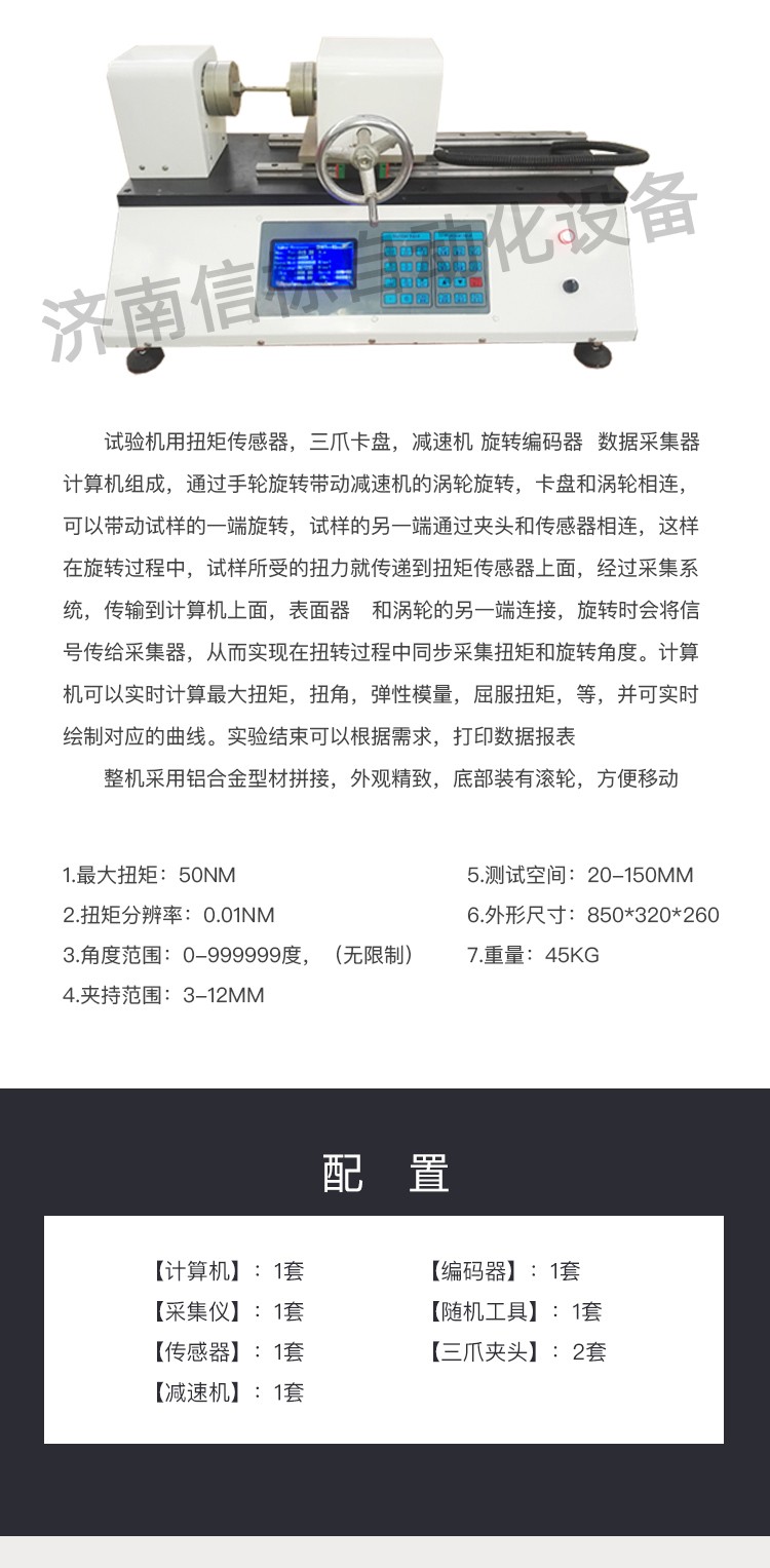 一、介紹 試驗(yàn)機(jī)用扭矩傳感器,三爪卡盤,減速機(jī) 旋轉(zhuǎn)編碼器 數(shù)據(jù)采集器 計(jì)算機(jī)組成,通過(guò)手輪旋轉(zhuǎn)帶動(dòng)減速機(jī)的渦輪旋轉(zhuǎn),卡盤和渦輪相連,可以帶動(dòng)試樣的一端旋轉(zhuǎn),試樣的另一端通過(guò)夾頭和傳感器相連,這樣在旋轉(zhuǎn)過(guò)程中,試樣所受的扭力就傳遞到扭矩傳感器上面,經(jīng)過(guò)采集系統(tǒng),傳輸?shù)接?jì)算機(jī)上面,表面器 和渦輪的另一端連接,旋轉(zhuǎn)時(shí)會(huì)將信號(hào)傳給采集器,從而實(shí)現(xiàn)在扭轉(zhuǎn)過(guò)程中同步采集扭矩和旋轉(zhuǎn)角度。計(jì)算機(jī)可以實(shí)時(shí)計(jì)算最大扭矩,扭角,彈性模量,屈服扭矩等,并可實(shí)時(shí)繪制對(duì)應(yīng)的曲線。實(shí)驗(yàn)結(jié)束可以根據(jù)需求,打印數(shù)據(jù)報(bào)表,整機(jī)采用鋁合金型材拼接,外觀精致,底部裝有滾輪,方便移動(dòng)。試驗(yàn)機(jī)用扭矩傳感器,三爪卡盤,減速機(jī) 旋轉(zhuǎn)編碼器 數(shù)據(jù)采集器 計(jì)算機(jī)組成,通過(guò)手輪旋轉(zhuǎn)帶動(dòng)減速機(jī)的渦輪旋轉(zhuǎn),卡盤和渦輪相連,可以帶動(dòng)試樣的一端旋轉(zhuǎn),試樣的另一端通過(guò)夾頭和傳感器相連,這樣在旋轉(zhuǎn)過(guò)程中,試樣所受的扭力就傳遞到扭矩傳感器上面,經(jīng)過(guò)采集系統(tǒng)。 二、基本參數(shù) 1.最大扭矩:50NM 2.扭矩分辨率:0.01NM 3.角度范圍:0-999999度,(無(wú)限制) 4.夾持范圍:3-12mm 5.測(cè)試空間:20-150mm 6.外形尺寸:850*320*260 7.重量:45kg 三配置: 1.計(jì)算機(jī):1套 2.采集儀:1套 3.傳感器:1套 4.減速機(jī):1套 5.編碼器:1套 6.隨機(jī)工具:1套 7.三爪夾頭:2套