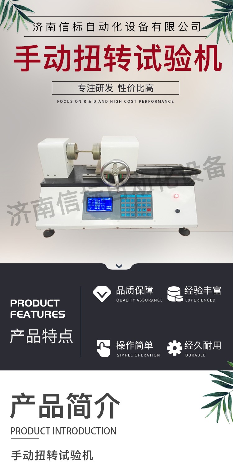 一、介紹 試驗機(jī)用扭矩傳感器,三爪卡盤,減速機(jī) 旋轉(zhuǎn)編碼器 數(shù)據(jù)采集器 計算機(jī)組成,通過手輪旋轉(zhuǎn)帶動減速機(jī)的渦輪旋轉(zhuǎn),卡盤和渦輪相連,可以帶動試樣的一端旋轉(zhuǎn),試樣的另一端通過夾頭和傳感器相連,這樣在旋轉(zhuǎn)過程中,試樣所受的扭力就傳遞到扭矩傳感器上面,經(jīng)過采集系統(tǒng),傳輸?shù)接嬎銠C(jī)上面,表面器 和渦輪的另一端連接,旋轉(zhuǎn)時會將信號傳給采集器,從而實現(xiàn)在扭轉(zhuǎn)過程中同步采集扭矩和旋轉(zhuǎn)角度。計算機(jī)可以實時計算最大扭矩,扭角,彈性模量,屈服扭矩等,并可實時繪制對應(yīng)的曲線。實驗結(jié)束可以根據(jù)需求,打印數(shù)據(jù)報表,整機(jī)采用鋁合金型材拼接,外觀精致,底部裝有滾輪,方便移動。試驗機(jī)用扭矩傳感器,三爪卡盤,減速機(jī) 旋轉(zhuǎn)編碼器 數(shù)據(jù)采集器 計算機(jī)組成,通過手輪旋轉(zhuǎn)帶動減速機(jī)的渦輪旋轉(zhuǎn),卡盤和渦輪相連,可以帶動試樣的一端旋轉(zhuǎn),試樣的另一端通過夾頭和傳感器相連,這樣在旋轉(zhuǎn)過程中,試樣所受的扭力就傳遞到扭矩傳感器上面,經(jīng)過采集系統(tǒng)。 二、基本參數(shù) 1.最大扭矩:50NM 2.扭矩分辨率:0.01NM 3.角度范圍:0-999999度,(無限制) 4.夾持范圍:3-12mm 5.測試空間:20-150mm 6.外形尺寸:850*320*260 7.重量:45kg 三、配置: 1.計算機(jī):1套 2.采集儀:1套 3.傳感器:1套 4.減速機(jī):1套 5.編碼器:1套 6.隨機(jī)工具:1套 7.三爪夾頭:2套