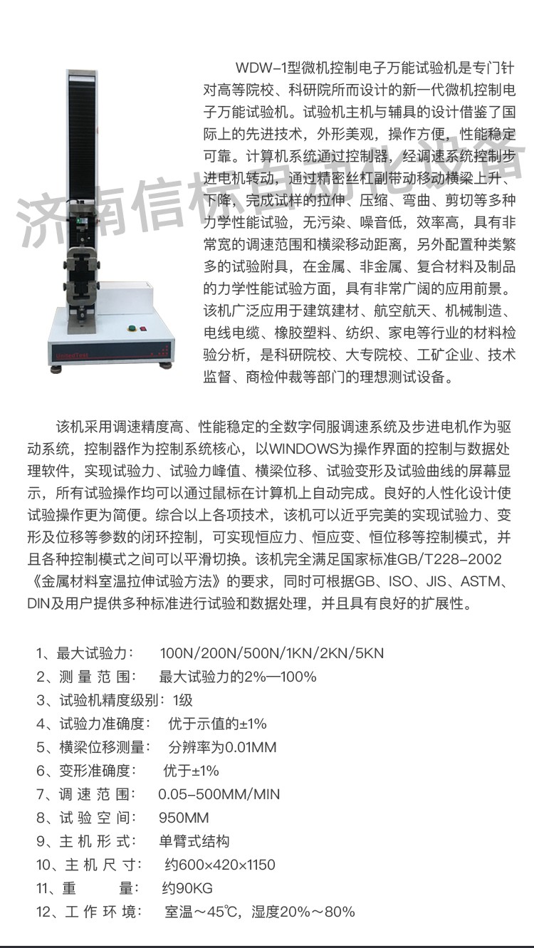 金屬材料壓縮彎曲實驗口罩塑料拉伸強度試驗機主要功能及特點: 1、主機: 1.1調(diào)速系統(tǒng)采用伺服電機和自主研發(fā)減速系統(tǒng),性能穩(wěn)定可靠,具有過流、過壓、過載等保護裝置。調(diào)速范圍可達0.05~500mm/min。 1.2傳動部分采用圓弧同步齒形帶,精密絲杠副傳動,傳動平穩(wěn),噪音低,傳動效率高。 1.3萬向節(jié)采用十字插銷結(jié)構(gòu),而且具有擺角限制功能,一方面便于試樣夾持,保證試驗同心度,另一方面很好的消除了不規(guī)則試樣對傳感器的影響。 2、控制系統(tǒng)、操作軟件及數(shù)據(jù)處理系統(tǒng) 2.1計算機控制系統(tǒng),具有集成度高、性能穩(wěn)定、調(diào)整方便等優(yōu)點??梢詫嶒灁?shù)據(jù)進行實時采集,對實驗特性曲線實現(xiàn)實時動態(tài)顯示,試驗數(shù)據(jù)文件能以Access常用數(shù)據(jù)庫或SQLserve大型數(shù)據(jù)庫的方式保存,方便實現(xiàn)客戶的資源共享及網(wǎng)絡(luò)管理,以及用戶的再分析。對于用戶自定義的各種word2000報表,該軟件可輕松實現(xiàn)訪問,解決了不同用戶或同一用戶在不同時期對試驗報表有不同需要的難題。該軟件可處理試驗力、位移、時間、變形的原始數(shù)據(jù)及由此派生的曲線。