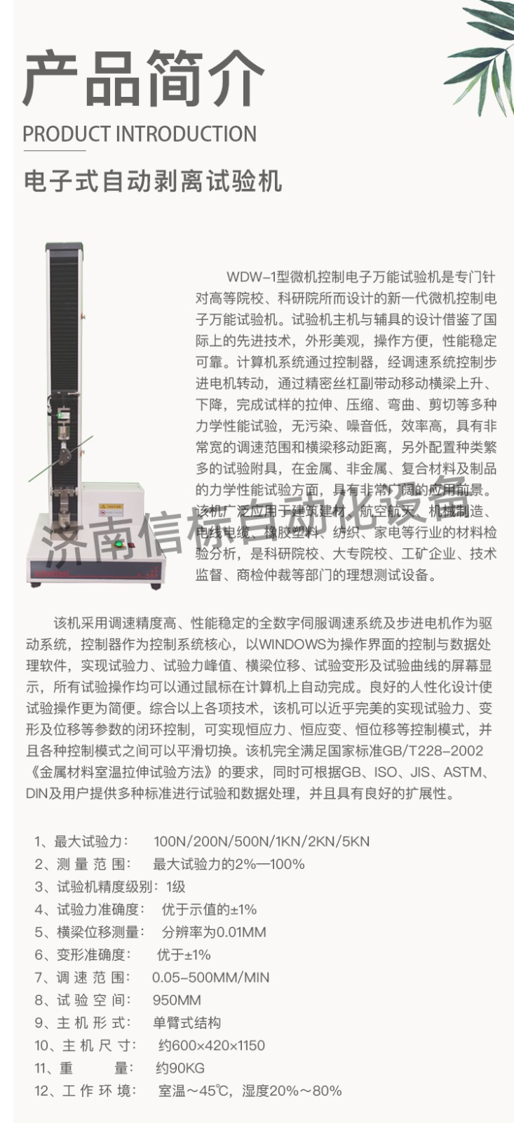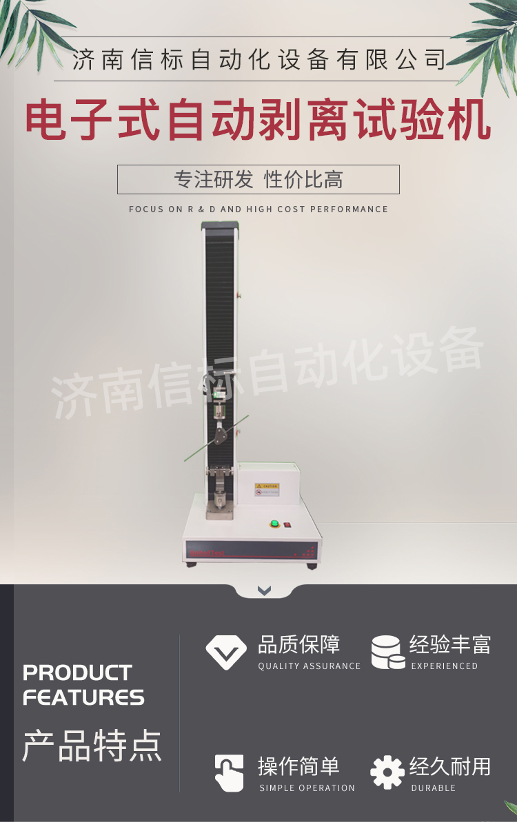 高強(qiáng)度膠黏劑膠帶浮棍法90度180度剝離強(qiáng)度試驗(yàn)機(jī)主要功能及特點(diǎn): 1、主機(jī): 1.1調(diào)速系統(tǒng)采用伺服電機(jī)和自主研發(fā)減速系統(tǒng),性能穩(wěn)定可靠,具有過(guò)流、過(guò)壓、過(guò)載等保護(hù)裝置。調(diào)速范圍可達(dá)0.05~500mm/min。 1.2傳動(dòng)部分采用圓弧同步齒形帶,精密絲杠副傳動(dòng),傳動(dòng)平穩(wěn),噪音低,傳動(dòng)效率高。 1.3萬(wàn)向節(jié)采用十字插銷結(jié)構(gòu),而且具有擺角限制功能,一方面便于試樣夾持,保證試驗(yàn)同心度,另一方面很好的消除了不規(guī)則試樣對(duì)傳感器的影響。 2、控制系統(tǒng)、操作軟件及數(shù)據(jù)處理系統(tǒng) 2.1計(jì)算機(jī)控制系統(tǒng),具有集成度高、性能穩(wěn)定、調(diào)整方便等優(yōu)點(diǎn)??梢詫?duì)實(shí)驗(yàn)數(shù)據(jù)進(jìn)行實(shí)時(shí)采集,對(duì)實(shí)驗(yàn)特性曲線實(shí)現(xiàn)實(shí)時(shí)動(dòng)態(tài)顯示,試驗(yàn)數(shù)據(jù)文件能以Access常用數(shù)據(jù)庫(kù)或SQLserve大型數(shù)據(jù)庫(kù)的方式保存,方便實(shí)現(xiàn)客戶的資源共享及網(wǎng)絡(luò)管理,以及用戶的再分析。對(duì)于用戶自定義的各種word2000報(bào)表,該軟件可輕松實(shí)現(xiàn)訪問(wèn),解決了不同用戶或同一用戶在不同時(shí)期對(duì)試驗(yàn)報(bào)表有不同需要的難題。該軟件可處理試驗(yàn)力、位移、時(shí)間、變形的原始數(shù)據(jù)及由此派生的曲線。