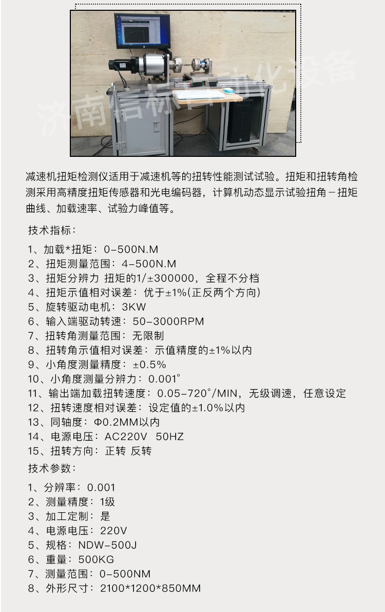 減速機(jī)扭矩試驗(yàn)機(jī) 減速機(jī)靜扭試驗(yàn)機(jī)產(chǎn)品特點(diǎn): 1、主機(jī):采用臥式結(jié)構(gòu),主體結(jié)構(gòu)采用框架結(jié)構(gòu),以保證整機(jī)的剛性。主傳動軸、夾具采用 鋼材,保證其使用壽命。試樣的安裝、拆卸方便、快捷。夾頭的移動端采用精密重型導(dǎo)軌,使其能自由移動,將試件的軸向拉力減少到 小。 2、驅(qū)動系統(tǒng):由進(jìn)口全數(shù)字交流伺服控制系統(tǒng)驅(qū)動,速度調(diào)節(jié)范圍寬,加載均勻、穩(wěn)定。 3、傳動系統(tǒng):采用精密減速器傳動,保證傳動的均勻、穩(wěn)定及傳動精度。橫向空間0~600mm范圍內(nèi)任意手動調(diào)節(jié)。 4、測量顯示系統(tǒng):該機(jī)采用光電編碼器采集試樣的扭轉(zhuǎn)角度,高精度扭矩傳感器采集試樣的扭矩,高精度旋轉(zhuǎn)編碼器測量試樣的扭轉(zhuǎn)變形。計(jì)算機(jī)屏幕顯示試樣的扭矩、扭轉(zhuǎn)角度、扭轉(zhuǎn)變形以及各類曲線等。 技術(shù)指標(biāo): 1. 加載*扭矩:0-500N.m 2. 扭矩測量范圍:4-500N.m 3. 扭矩分辨力 扭矩的1/±300000,全程不分檔 4. 扭矩示值相對誤差:優(yōu)于±1%(正反兩個(gè)方向) 5. 旋轉(zhuǎn)驅(qū)動電機(jī):3kW 6. 輸入端驅(qū)動轉(zhuǎn)速:50-3000rpm 7. 扭轉(zhuǎn)角測量范圍:無限制 8. 扭轉(zhuǎn)角示值相對誤差:示值精度的±1%以內(nèi) 9. 小角度測量精度:±0.5% 10.小角度測量分辨力:0.001° 11.輸出端加載扭轉(zhuǎn)速度:0.05-720°/min,無級調(diào)速,任意設(shè)定 12.扭轉(zhuǎn)速度相對誤差:設(shè)定值的±1.0%以內(nèi) 13.同軸度:Ф0.2mm以內(nèi) 14.電源電壓:AC220V 50Hz 15.扭轉(zhuǎn)方向:正轉(zhuǎn) 反轉(zhuǎn) 技術(shù)參數(shù): 1分辨率:0.001 2測量精度:1級 3加工定制:是 4電源電壓:220v 5規(guī)格:NDW-500J 6重量:500kg 7測量范圍:0-500nm 8外形尺寸:2100*1200*850mm