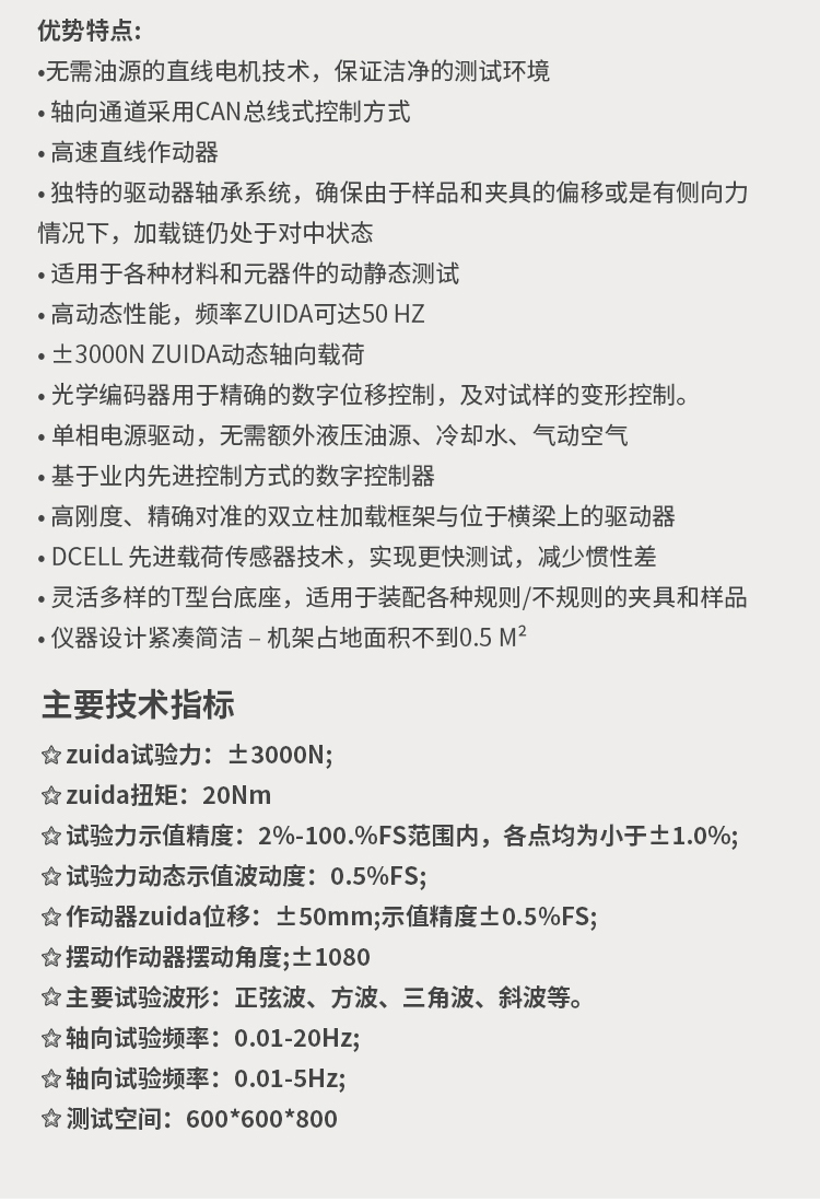 該試驗(yàn)系統(tǒng),既能進(jìn)行動(dòng)態(tài)的高、低周疲勞試驗(yàn)、程序控制疲勞試驗(yàn),也能進(jìn)行靜態(tài)的恒速率、恒應(yīng)變、恒應(yīng)力控制下的試驗(yàn)和各種常規(guī)的力學(xué)性能試驗(yàn),還可進(jìn)行斷裂力學(xué)試驗(yàn),也可以對(duì)廣義范圍上材料或構(gòu)件的疲勞壽命、裂紋擴(kuò)展、斷裂韌性性能測試、實(shí)際試件的安全性評(píng)價(jià)、工況模擬等,因此有著其它任何種類的試驗(yàn)機(jī)所不能比擬的優(yōu)勢,是國際疲勞力學(xué)研究領(lǐng)域界最推崇的材料試驗(yàn)設(shè)備。 由于該系統(tǒng)采用自適應(yīng)無間隙的電動(dòng)伺服作動(dòng)器,頻響速度快,噪音低,節(jié)能環(huán)保,非常適合企業(yè)和研究機(jī)構(gòu)對(duì)小零部件的研究測試! 2.優(yōu)勢特點(diǎn): ?無需油源的直線電機(jī)技術(shù),保證潔凈的測試環(huán)境 ? 軸向通道采用Can總線式控制方式 ? 高速直線作動(dòng)器 ? 獨(dú)特的驅(qū)動(dòng)器軸承系統(tǒng),確保由于樣品和夾具的偏移或是有側(cè)向力情況下,加載鏈仍處于對(duì)中狀態(tài) ? 適用于各種材料和元器件的動(dòng)靜態(tài)測試 ? 高動(dòng)態(tài)性能,頻率zuida可達(dá)50 Hz ? ±3000N zuida動(dòng)態(tài)軸向載荷 ? 光學(xué)編碼器用于精確的數(shù)字位移控制,及對(duì)試樣的變形控制。 ? 單相電源驅(qū)動(dòng),無需額外液壓油源、冷卻水、氣動(dòng)空氣 ? 基于業(yè)內(nèi)先進(jìn)控制方式的數(shù)字控制器 ? 高剛度、精確對(duì)準(zhǔn)的雙立柱加載框架與位于橫梁上的驅(qū)動(dòng)器 ? Dcell 先進(jìn)載荷傳感器技術(shù),實(shí)現(xiàn)更快測試,減少慣性差 ? 靈活多樣的T型臺(tái)底座,適用于裝配各種規(guī)則/不規(guī)則的夾具和樣品