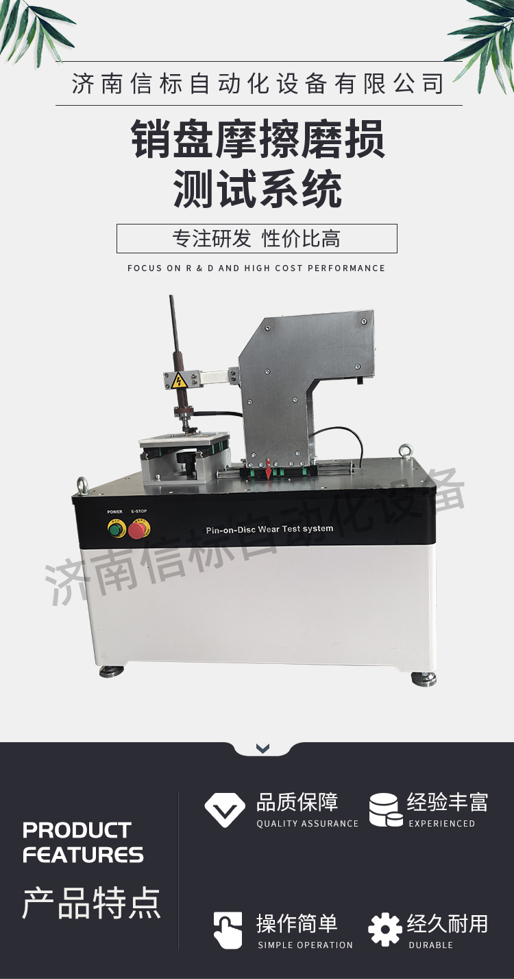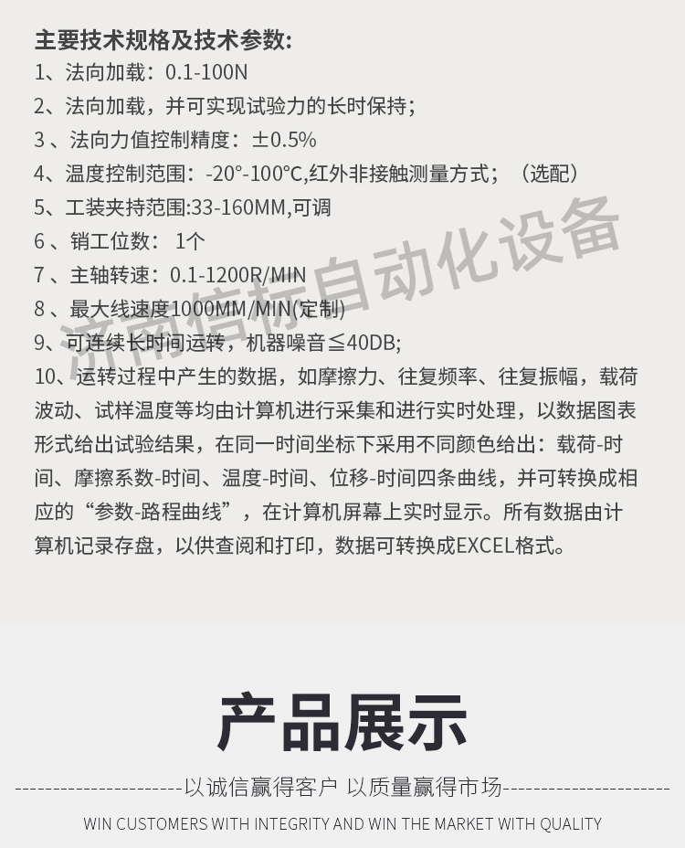 主要技術(shù)規(guī)格及技術(shù)參數(shù) 2.1法向加載:0.1-100N 2.2法向加載,并可實現(xiàn)試驗力的長時保持; 2.3 法向力值控制精度:±0.5% 2.4溫度控制范圍:-20°-100℃,紅外非接觸測量方式;(選配) 2.5工裝夾持范圍:33-160mm,可調(diào) 2.6 銷工位數(shù): 1個 2.7 主軸轉(zhuǎn)速:0.1-1200r/min 2.8 最大線速度1000mm/min(定制) 2.9可連續(xù)長時間運轉(zhuǎn),機器噪音≦40dB; 2.10運轉(zhuǎn)過程中產(chǎn)生的數(shù)據(jù),如摩擦力、往復(fù)頻率、往復(fù)振幅,載荷波動、試樣溫度等均由計算機進行采集和進行實時處理,以數(shù)據(jù)圖表形式給出試驗結(jié)果,在同一時間坐標下采用不同顏色給出:載荷-時間、摩擦系數(shù)-時間、溫度-時間、位移-時間四條曲線,并可轉(zhuǎn)換成相應(yīng)的“參數(shù)-路程曲線”,在計算機屏幕上實時顯示。所有數(shù)據(jù)由計算機記錄存盤,以供查閱和打印,數(shù)據(jù)可轉(zhuǎn)換成Excel格式。1.主要技術(shù)要求及滿足情況:(水平運動總成選配) 為滿足2的各項技術(shù)要求,本產(chǎn)品擬采用以下方案 3.1該試驗機由法向加載系統(tǒng)、水平杠桿,扭矩測力系統(tǒng),溫控系統(tǒng),其冷卻及潤滑裝置、電氣控制柜及計算機實時數(shù)據(jù)采集及控制系統(tǒng)(包括軟件)等部分組成; 試驗機主機主要由主機機座、水平機座、法向主軸及其驅(qū)動系統(tǒng)、試驗力施加裝置、摩擦扭矩及位移高精度傳感測量系統(tǒng)、試驗力測量及摩擦溫度測量系統(tǒng)等組成;試驗機法向加載系統(tǒng)采用杠桿+砝碼,精度高,可靠性好;水平加載系統(tǒng)采用直線電機作為加載系統(tǒng),控制精度高,相應(yīng)快,主機機座采用較大質(zhì)量的鑄鐵件,固有頻率高,吸震抗震性能好,箱體座也是采用鐵件經(jīng)數(shù)控鏜加工后將電主軸牢固鎖緊在箱體座中,這樣可以提高加載工作時的平穩(wěn)性。