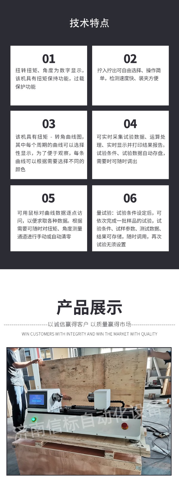 數(shù)顯扭轉(zhuǎn)試驗機(jī)技術(shù)指標(biāo): 1 扭矩測量范圍:20Nm 2 扭矩分辨力:±1/300000 3 轉(zhuǎn)角最小讀數(shù)值:0.01圈 4 扭矩示值相對誤差:測量范圍內(nèi)優(yōu)于±1% (正轉(zhuǎn)和反轉(zhuǎn)兩個方向) 5 扭矩示值重復(fù)性相對誤差:測量范圍內(nèi)≤1% 6 試驗機(jī)加載速度:0.004r/min~20r/min 7 兩夾頭間距離:0~250mm 8 兩夾頭間的同軸度誤差:≤Φ0.10mm 9 試驗機(jī)超過額定扭矩的5%~10%時,試驗機(jī)自動停機(jī)(也可以自行設(shè)置) 具有過電壓、過電流、超速、過載等安全保護(hù) 10 電源電壓:220VAC±10% 50Hz 11 主機(jī)尺寸:1700×700×1200(mm) 座式操作 功能特點: 1、適用于WINDOWS平臺的中文試驗軟件,實現(xiàn)試驗數(shù)據(jù)采集處理。 2、可實時采集試驗數(shù)據(jù)、運算處理、實時顯示并打印結(jié)果報告。 3、曲線遍歷:可用鼠標(biāo)對曲線數(shù)據(jù)逐點訪問,以便求取各種數(shù)據(jù)。扭矩與扭角關(guān)系曲線中能反映任意點扭矩—角度的關(guān)系,能方便地在曲線上找到所求數(shù)據(jù)點;可方便地對曲線局部放大還原等。 4、根據(jù)需要可隨時對扭矩、角度測量通道進(jìn)行手動或自動清零。 5、自動存盤:試驗條件、試驗數(shù)據(jù)自動存盤,需要時可隨時調(diào)出。 6、批量試驗:試驗條件設(shè)定后,可依次完成一批樣品的試驗,試驗條件、試樣參數(shù)、測試數(shù)據(jù)、結(jié)果可存儲,隨時調(diào)用,再次試驗無須設(shè)置。 7、打印試驗報表。